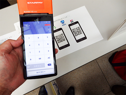 すると顧客のスマホのQRコードを読み取るカメラが起動するので、QRコードを読み込む。StarPayの決済端末は決済ブランドを自動で識別する機能が搭載されており、決済サービスを入力するなどの手間が要らない。店員が顧客のQRコードを判別する必要がないのだ。