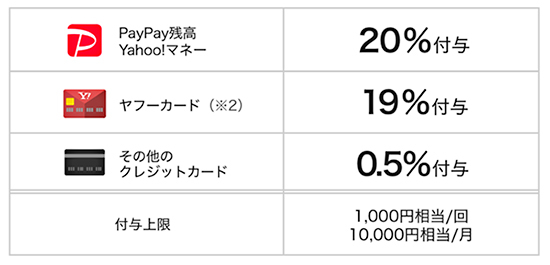付与上限は1回当たり1000円相当、1カ月当たり1万円相当。ヤフーカードの決済が19%の付与、その他クレジットカードが0.5%の付与になる。