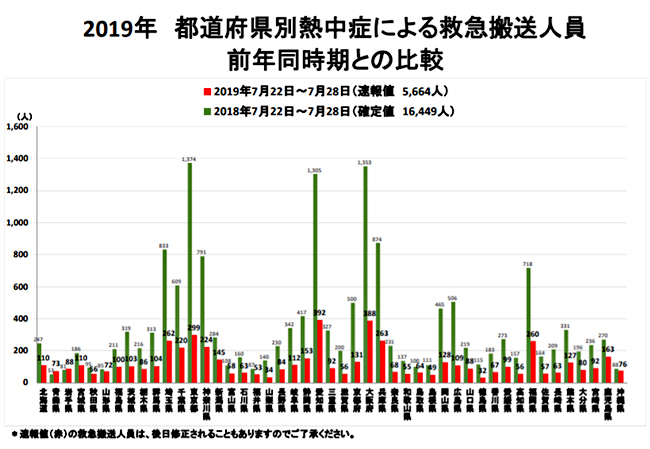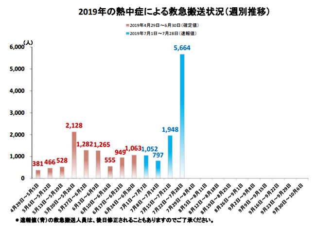 総務省消防庁が発表している熱中症情報によると、7月22~28日の1週間に全国で熱中症で救急搬送された人数は速報値で5664人。前週の1948人から大幅に増加し、2.9倍の数値を記録した。
