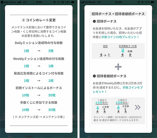 まずは、変更された部分からみていきたい。今回のアップデートに伴い、コインレートは変更前の5倍になった。デイリーミッション(1日に6000歩)達成で獲得できるコインが1枚から5枚、初期インストールによるボーナスが10枚から50枚、歩数くじに参加できる枚数が10枚から50枚に修正されている。
