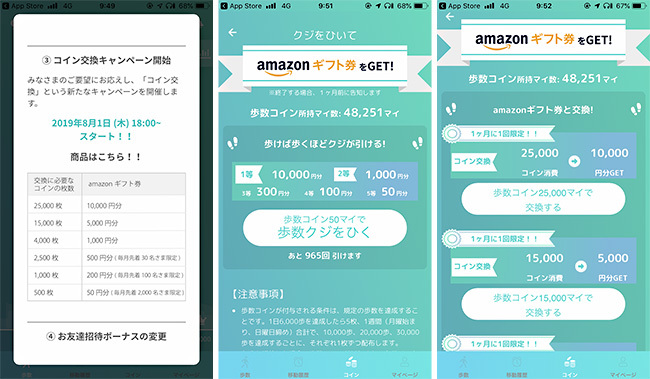 今回のアップデートの目玉といえるのが、新たに加わった「コイン交換」だ。これまでは、歩数くじのみしかコインの使い道がなかったので運の要素が強かった。コイン交換では交換率が高くないものの、確実に一定の枚数をAmazonギフト券に交換することが可能になった。