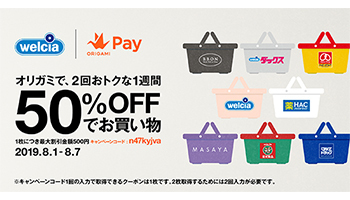 Origamiは8月1日に複数のドラッグストアを運営するウエルシアグループと共同でキャンペーンを開始。スマホ決済「Origami Pay」のユーザーに同グループ店舗で使える50%オフクーポン(最大500円割引)を2枚配布する。期間は8月7日まで。