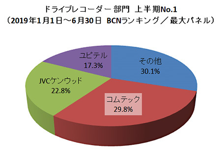 全国の主要家電量販店・ネットショップのPOSデータを集計した「BCNランキング」のドライブレコーダー部門で、2019年1月1日~6月30日の販売台数シェアでNo.1を獲得したのは、コムテック。18年の年間販売台数No.1に輝いた同社がトップを維持した。