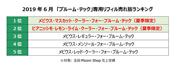 日本たばこ産業(JT)が提供する低温加熱式たばこ用デバイス「プルーム・テック」専用リフィルで、季節限定フレーバーシリーズ「メビウス・マスカット・クーラー・フォー・プルーム・テック」「ピアニッシモ・レモン・ライム・クーラー・フォー・プルーム・テック」の売れ行きが好調だ。6月4日の発売から1カ月以上が経ち、全国Ploom Shopにおけるプルーム・テック専用リフィルの2019年6月販売実績ランキングで、それぞれ第1位、第2位を獲得した。