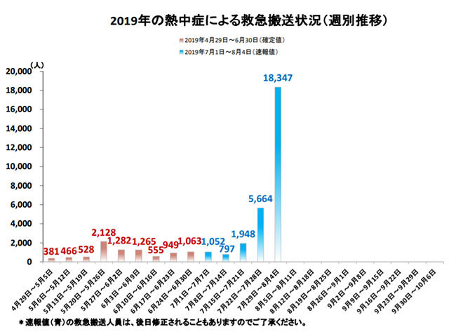 総務省消防庁が発表している熱中症情報によると、7月29日~8月4日の1週間に全国で熱中症で救急搬送された人数は速報値で1万8347人。前週の5664人から約3.2倍に急増し、死亡者数は57人で今年最多を記録した。