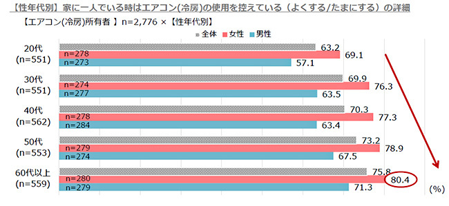 「家に一人でいる時はエアコンの使用を控えている」と答えた人の性別・年代別内訳をみると、どの年代でも女性の方が高く、年代が上がるにつれて節電意識が高くなる。最多は60代以上の女性で80.4%となった。
