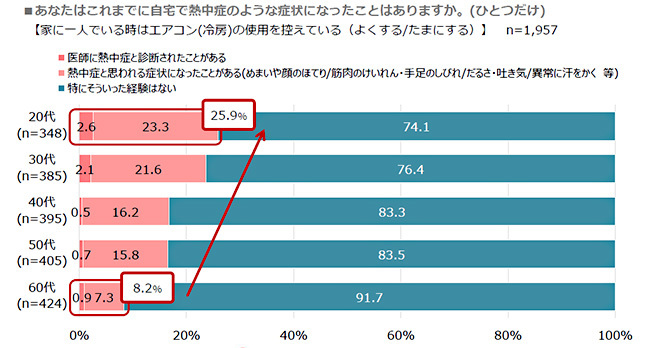 一方、「家に一人でいる時はエアコンの使用を控えている」で「よくする/たまにする」と答えた人に、室内での熱中症の経験を聞いたところ、20代は「医師に熱中症と診断されたことがある」(2.6%)と「熱中症と思われる症状になったことがある」(23.3%)と合わせて25.9%と高かったが、年代が上がるにつれて自覚症状が薄れていく傾向にあった。