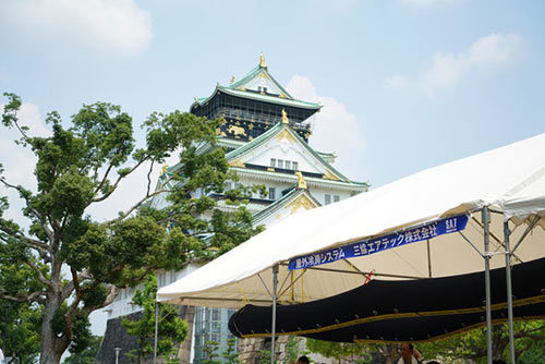 8月1~31日の期間、大阪城公園本丸広場で大型空調装置「エアタイタン」と専用拡散ダクト「エアホースワン」(特許出願中)を用いた「大型屋外冷房システム」が設置となっている。三協エアテックが実証実験を実施しており、炎暑から観光客を守ることが目的だ。