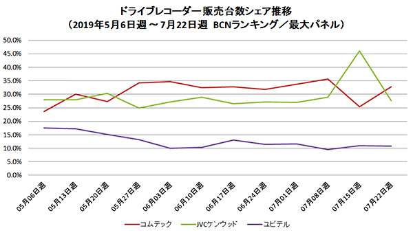 ここ数カ月、コムテックが優位に推移していたが、7月各週のメーカー別販売台数シェアでは、JVCケンウッドが躍進。7月15日週に、45%を超えるシェアで他社を圧倒した。しかし、翌週にコムテックが挽回して首位に立っており、依然として熾烈な競争が続いている。