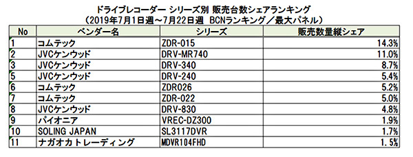 全国の家電量販店やECショップでPOSデータを集計する「BCNランキング」によると、7月のドライブレコーダーの販売台数は前年同月比で105.3%。6・7月の2か月連続で前年を超えた。特に、JVCケンウッドは216.5%という大幅な伸びを記録している。