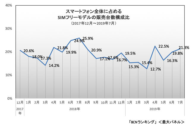 家電量販店の実売データを集計した「BCNランキング」によると、「格安スマホ」とも呼ばれるSIMフリースマホの販売台数が伸び始めたのは2016年4月以降。販売台数構成比は、やがて16年12月には2割を超えて、一時、25.9%まで拡大したが、ここ半年は勢いをなくし、月によっては2割を切る水準まで低下している。