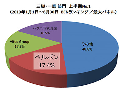 実は三脚・一脚部門は昨年(2018年1月1日~12月31日)もトップ争いは熾烈で、ハクバ写真産業(17.2%)、Vitec Group(17.1%)、ベルボン(16.1%)という並びだった。この半年を振り返ると、2社を抜いたベルボンの伸長が際立つ。