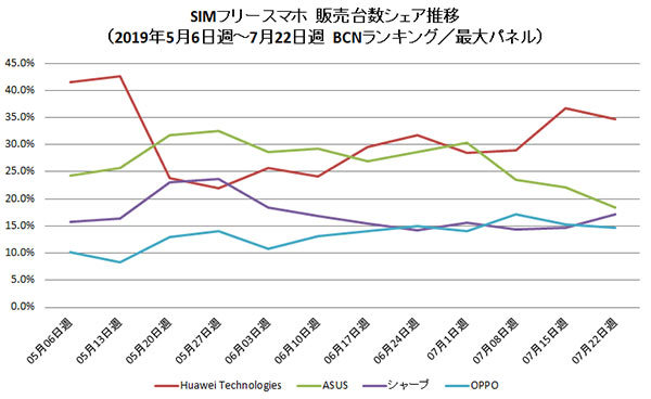 全国の家電量販店やECショップでPOSデータを集計する「BCNランキング」によると、7月のSIMフリースマートフォンの販売台数前年比は73.0%。上位陣の販売台数が軒並み前年を下回っており、市場全体を押し下げた。米中貿易摩擦の影響で5月・6月とシェアを下げていたファーウェイは徐々にシェアが回復傾向にあり、7月15日週~22日週はシェアを30%台に戻した。