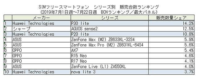 シリーズ別では、ファーウェイの「HUAWEI P30 lite」が14.2%のシェアで1位を獲得した。同製品は、延期していた発売日を、楽天モバイルが8月5日に、au、UQコミュニケーションズ、ワイモバイルが8月8日に、LINEモバイル、mineoが8月9日に決定。消費者の信頼回復につながる動きは、8月以降のシェアに影響を与えそうだ。一方、ASUSは8月後半に最新の「ZenFone 6」シリーズの国内発表を控える。しばらく前年割れが続いているSIMフリースマホ市場だが、新モデルの投入によって活性化される可能性はある。(BCN・大蔵 大輔)