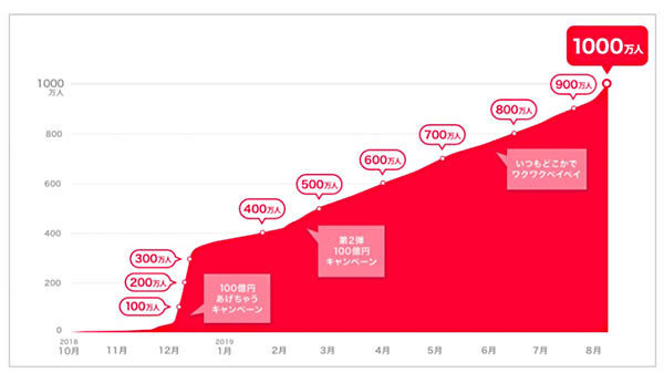 スマホ決済を世に知らしめた還元キャンペーンの火付け役であるPayPayは、8月7日にサービス登録者数が1000万人を突破。ローンチからわずか10カ月という短期間で大台に到達した。