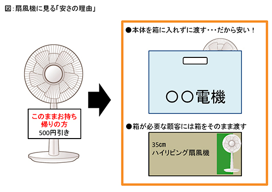 扇風機の場合なら、「展示品だから安い」という理由もさることながら、「このままの状態でお渡しするから安い」ということを加えて明示してみる。すると顧客は「だから安いのか」と納得するだろう。