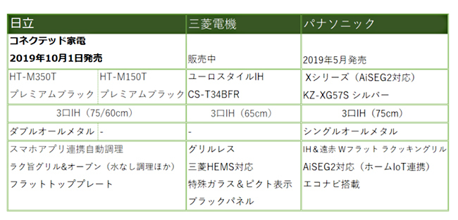 ビルトインIHの機能は多岐に渡り、いくつかの比較するポイントがあるが、今回はスマートフォン(スマホ)連携またはHEMS対応機種に限り、日立グローバルライフソリューションズ(日立)・三菱電機・パナソニックの3社4製品をピックアップした。