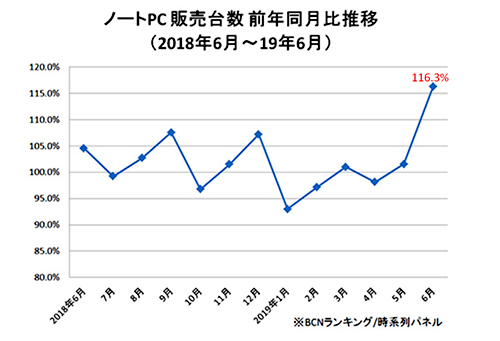 ――家電量販店やネットショップのPOSデータを集計した「BCNランキング」でも、6月のノートPCの販売台数は17年8月以来となる16.3%増の二桁成長になりました。