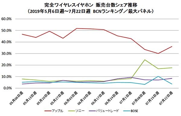 7月各週のメーカー別販売台数シェアでは、2週目にソニーが一気にシェアを10%上げ、首位のアップルとの差を10ポイント以内に詰めた。3週目・4週目も20%近いシェアをキープしており、アップルを射程圏内に置いている。