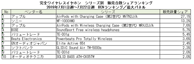 ベストテンには、10時間の連続再生が可能なバリュートレード(AVIOT)の「TE-D01g」やBeats初となる完全ワイヤレスイヤホン「Powerbeats Pro」など、直近3カ月で発売した新製品も入った。多彩な製品の登場で覇権を握るAirPodsの優位は、以前のような圧倒的なものではなくなりつつあるようだ。(BCN・大蔵 大輔)