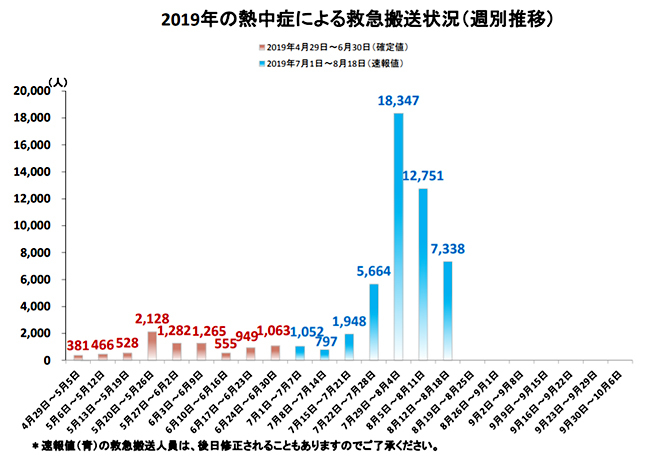 現時点で今年の熱中症による救急搬送数がピークを迎えたのは、1万8347人を記録した2週前の7月29日~8月4日週。翌週が1万2751人、翌々週が7338人と右肩下がりに減少している。
