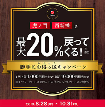 PayPayは、東京の「虎ノ門1丁目」「西新橋1、2丁目」だけの超エリア限定で8月28日から10月31日まで実施する、虎ノ門・西新橋で最大20%戻ってくる!「勝手にお得っ区(おとっく)」キャンペーンに参加する74店舗(8月20日時点)をホームページで明らかにした。