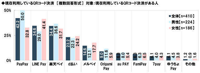 「現在利用しているQRコード決済がある」と答えたのは410人。「何を使っているか」を聞いたところ、全体で1位が「PayPay」(42.2%)、2位が「LINE Pay」(34.6%)、3位が「楽天ペイ」(34.4%)になったという。男性では、1位がPayPay(50.0%)、2位が楽天ペイ(36.6%)、3位がLINE Pay(29.0%)。女性では、1位がLINE Pay(41.4%)、2位がPayPay(32.8%)、3位が楽天ペイ(31.7%)とのことだ。