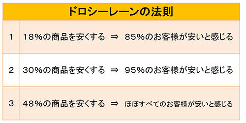 図は、「ドロシーレーンの法則」と呼ばれ、「どのくらいのアイテム数を安くすれば、どのくらいの顧客がこの店は安いと感じるか?」という比率を示したもの。カテゴリーの18%の商品を安くすれば85%の顧客が、30%の商品を安くすれば95%の顧客が、48%の商品を安くすればほぼすべての顧客が安いと感じる。