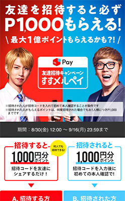 スマートフォン(スマホ)決済サービス「メルペイ」で、友達を招待すると必ず1000ポイントもらえる「友達招待キャンペーン すすメルペイ」が8月30正午から実施となった。期間は9月16日23時59分まで。招待可能な人数に制限はないが、期間中の付与ポイント上限は最大で1億ポイントとなっている。