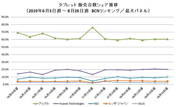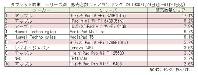 8月週次のメーカーシェア推移では先月から順位・シェアともに大きな変動はない。シリーズ別では「iPad Wi-Fi 32GB(6th)」が17.1%の高シェアで1位。同社の「iPad mini Wi-Fi 64GB(5th)」「iPad Air Wi-Fi 64GB」が続く。Androidタブレットで首位に立ったのは「MediaPad M5 lite」。こちらも全体で6.7%のシェアを確保しており、売れ筋となっている。(BCN・大蔵 大輔)