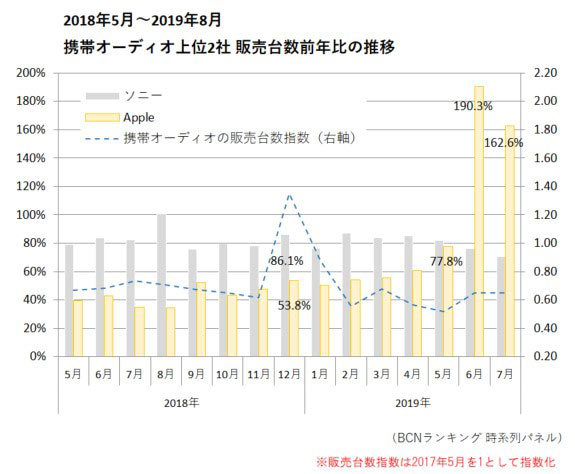 家電量販店・ECサイトのPOSデータを集計した「BCNランキング」によると、モデルチェンジ効果で、19年6月の携帯オーディオに占めるアップルの販売台数シェアは前月の18.5%から34.8%に大幅に上昇。シェアだけでなく、販売台数も前月比238.8%、前年同月比190.3%と大きく跳ね上がった。