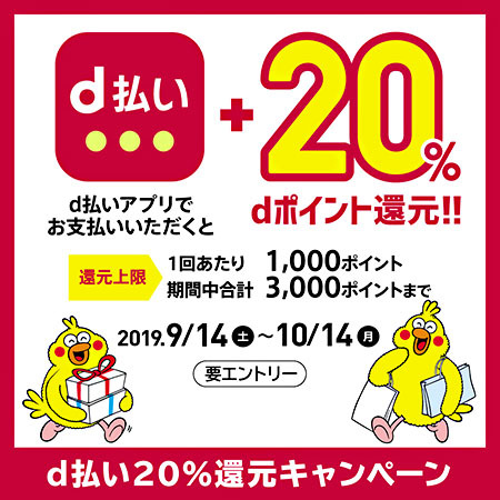 また、期間限定で開催のd払い20%還元キャンペーンは、エントリーしてd払いアプリで支払えばプラス20%のdポイントが還元される。