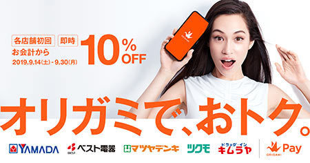 Origamiは9月11日、ヤマダ電機グループ(ヤマダ電機、ベスト電器、マツヤデンキ、ツクモ、キムラヤ)でスマートフォン決済サービス「Origami Pay」を利用すると支払いが10%オフになるキャンペーンを発表した。