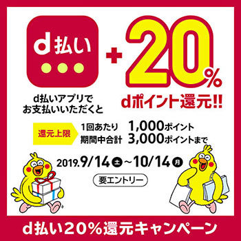 NTTドコモのスマホ決済サービス「d払い」は、9月14日~10月14日の1カ月間、20%還元キャンペーンを実施する。上限金額は1回当たり1000ポイント、期間中合計で3000ポイント。キャンペーンサイトからのエントリーが必須。d払いは、キャンペーン開始日からココカラファイングループ約1300店舗でも対応を開始。増税前の買いだめ需要の取り込みも狙う。