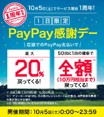 まもなくサービス開始1周年を迎えるPayPayは、10月5日に1日限定のキャンペーン「「PayPay感謝デー」を開催。対象は全ての加盟店で、決済金額の最大20%を還元する。付与上限は、1回当たり1000円、1日5000円。合わせて、「PayPayチャンス」をパワーアップした「感謝デー限定PayPayチャンス」を実施。50回に1回の確率で支払額の残額相当のPayPayボーナスを付与する。上限は1回10万円、1日10万円。