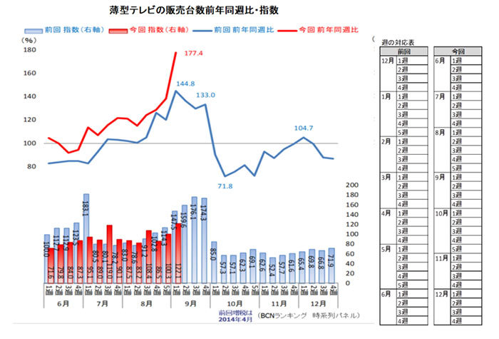全国の主要家電量販店・ネットショップのPOSデータを集計した「BCNランキング」の速報値によると、消費増税前における薄型テレビの駆け込み需要(販売台数ベース)は7月第1週から発生していたことが明らかになった。デジタル家電市場全体では、9月1週から駆け込みがスタートしたため、薄型テレビがそれよりも2カ月早かったことが分かった。最新の9月1週は、前年同週比177.4%で前回比より32.6ポイントも高い伸びを示しており、残り3週も大きな伸びが期待できそうだ。