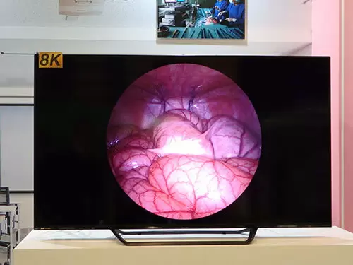 ドコモの5Gプレサービスの発表会で展示されたブースでは、シャープの8Kディスプレイに内視鏡による豚の内臓が映し出されていた。太い血管からさらに細かく分岐する血管まで目視で確認できるほど高精細だった。こうした映像が、遠隔地の病院でも確認できるようになる。