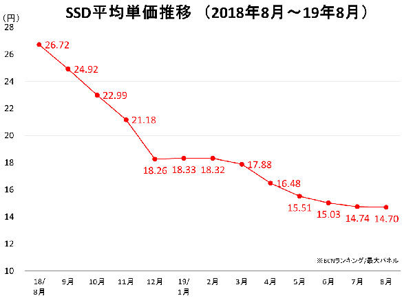 長い間続いていたSSDの1GB当たりの単価下落が緩やかになっていることが、全国の家電量販店やECショップでPOSデータを集計する「BCNランキング」から分かった。