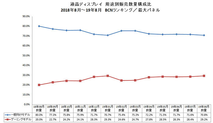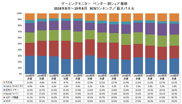 液晶ディスプレイ(LCD)市場におけるゲーミングモデルの割合が高まってきている。家電量販店・ネットショップのPOSデータを集計する「BCNランキング」によると、今年に入り、構成比は全体の25%前後で推移。前年比で150%を超える成長をみせている。メーカー別の販売台数シェアでトップを走っているのはASUS。8月は26.0%のシェアを獲得し、並み居る競合を抑えている。