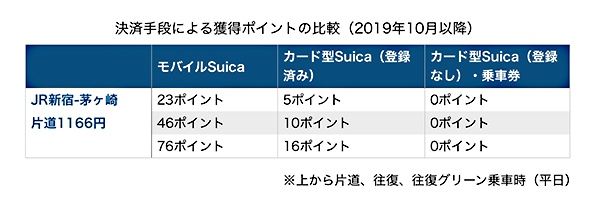 すでにモバイルSuica/カード型Suicaを使っているものの、面倒でJR東日本グループの共通ポイント「JRE POINT」が貯まるようにウェブ上で設定していない人も、10月1日以降、初めてJR東日本の路線に乗車する前に事前準備を済ませよう。はしたポイントなど要らぬ、と割り切れるならそのままでも構わないが、例えば、湘南新宿ラインなら乗り換えなし・乗車時間約1時間の新宿-茅ヶ崎間(片道1166円)は往復で46ポイント(46円相当)たまるので、ひと手間を惜しまないことを強くおすすめしたい。