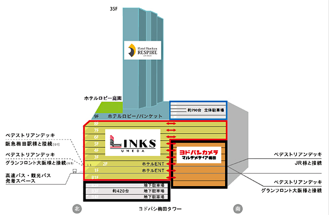 ヨドバシ梅田タワーの敷地面積は1万7200平方メートル、延べ床面積は22万平方メートル。駐車場1200台。そのうちLINKS UMEDAは地下1階~地上8階でフロア面積5万5100平方メートルとなる。ホテル阪急レスパイア大阪は、1・2・9階~35階でフロア面積は4万6000平方メートル、ヨドバシカメラマルチメディア梅田は地下2階~地上5階で3万5600平方メートル。