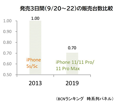 9月20日発売の新モデル「iPhone 11/11 Pro/Pro Max」では、2017年9月発売の「iPhone 8」以来、製品名に数字表記が復活した。発売日は13年9月発売の「iPhone 5s/5c」と同じ。そこで過去のデータを掘り返し、発売3日間の販売台数を比較した。