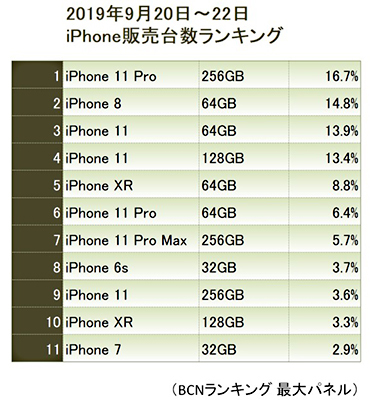 実は、19年9月20~22日の3日間に、iPhone 11 Proの256GBに次いで売れたiPhoneは、一部店舗では完売しているiPhone 8の64GBだった。MNPならかなり安く購入できるうえ、重さ194g、画面サイズ6.1インチで幅75.7mmという微妙なサイズの「11」より、重さ148g、画面サイズ4.7インチで幅67.3mmの「8」のほうが使いやすいと判断する層が多いならば、今後も根強く売れ続けるだろう。(BCN・嵯峨野 芙美)