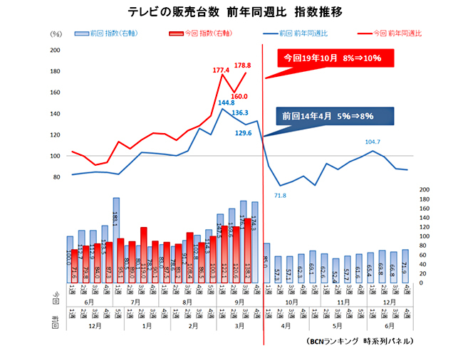デジタル家電における今回の増税前の駆け込みは、前回より伸びは大きい。なお、BCNランキングの週次データは月曜~日曜日で集計しているため、9月4週は9月23~29日となる。