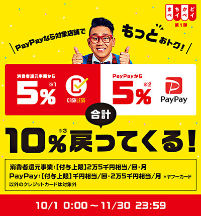 スマホ決済の中でも利用者が多いPayPayは、増税後のタイミングで大量のキャンペーンが同時開催される。まずは、キャッシュレス・消費者還元事業登録店舗が対象となる「まちかどペイペイ」。これは還元事業の5%にPayPayがさらに5%を加えて、最大10%を還元するというもの。消費者還元補助の上限が2万5000円相当/回・月で、キャンペーンの上限は1000円相当/回、2万5000円相当/月。ヤフーカード以外のクレジットカードは対象外となる。今回は第1弾で、期間は11月30日まで。