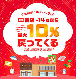 近所にスーパーマーケットのライフがあるなら、9月30日まで開催していた月替わりキャンペーン「10時~14時がおトク!家計を応援!スーパーマーケット大還元祭」の延長戦も見逃せない。期間は10月1~10日まで。対象店舗で10~14時に決済すると、最大10%を還元する。