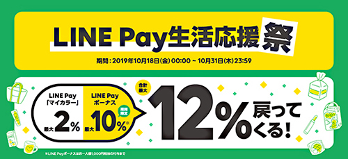 LINE Payは、増税後の生活を応援するキャンペーンとして「誰でも最大12%戻ってくるLINE Pay生活応援祭」を開催する。期間は10月18~31日。