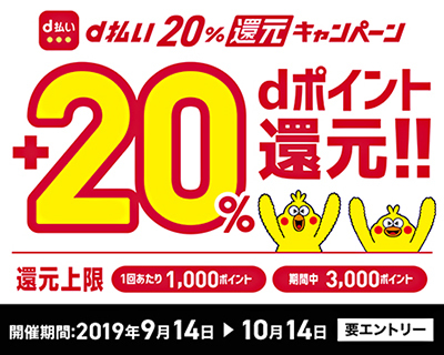 NTTドコモの「d払い」が9月14日から実施している20%還元キャンペーンの期限が10月14日なので、増税後も2週間は有効だ。上限金額は1回当たり1000ポイント、期間中合計で3000ポイント。キャンペーンサイトからのエントリーが必須。