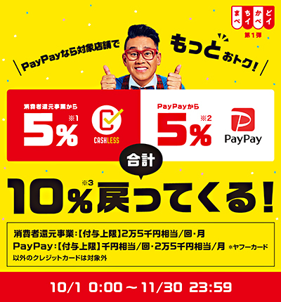 スマホ決済サービス拡大の立役者であるPayPayは、盛り上がった昨年の20%還元祭を彷彿とさせる勢いでキャンペーンを展開している。長期のものでいえば、11月30日まで展開する「まちかどペイペイ」。還元事業の5%にPayPayがさらに5%を追加、最大10%を還元するキャンペーンは対象店舗が多く、還元率だけでなく活用のハードルが低いのも魅力だ。