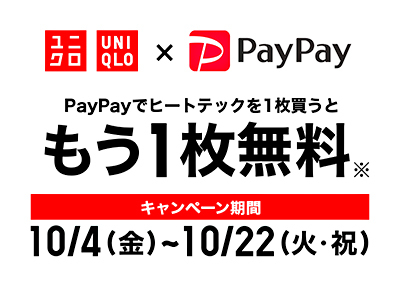 次に、10月4~22日で開催している「PayPayでのお支払いでヒートテックを1枚買うともう1枚無料キャンペーン」。こちらは、期間中にユニクロ店頭でPayPayを利用してヒートテックインナーを購入すると、もう1枚が無料になるというもの。還元とは異なるアプローチの珍しいキャンペーンだ。